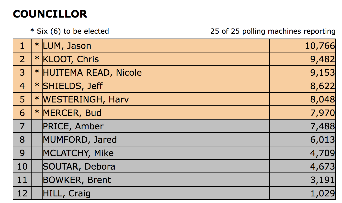With all polls reporting Saturday night at 10:12 p.m., Councillor Jason Lum led all 12 council candidates with 10,766 votes. Lum, the top vote getter in 2018, is a small business owner who was first elected to council in 2011. He currently serves as chair of the Fraser Valley Regional District Board of Directors and serves on a host of committees.