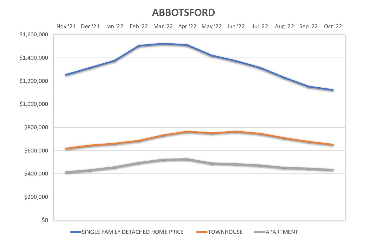 ABBOTSFORD — The benchmark price of a home in Abbotsford continued to slide last month as rising interest rates continued to cool the market. According to figures released by the Fraser Valley Real Estate Board this week, the price of a single-family detached home fell 2.5 per cent from September to October, dropping to $1,121,300. That’s down over $400,000 or 26 per cent since the market peaked in March.