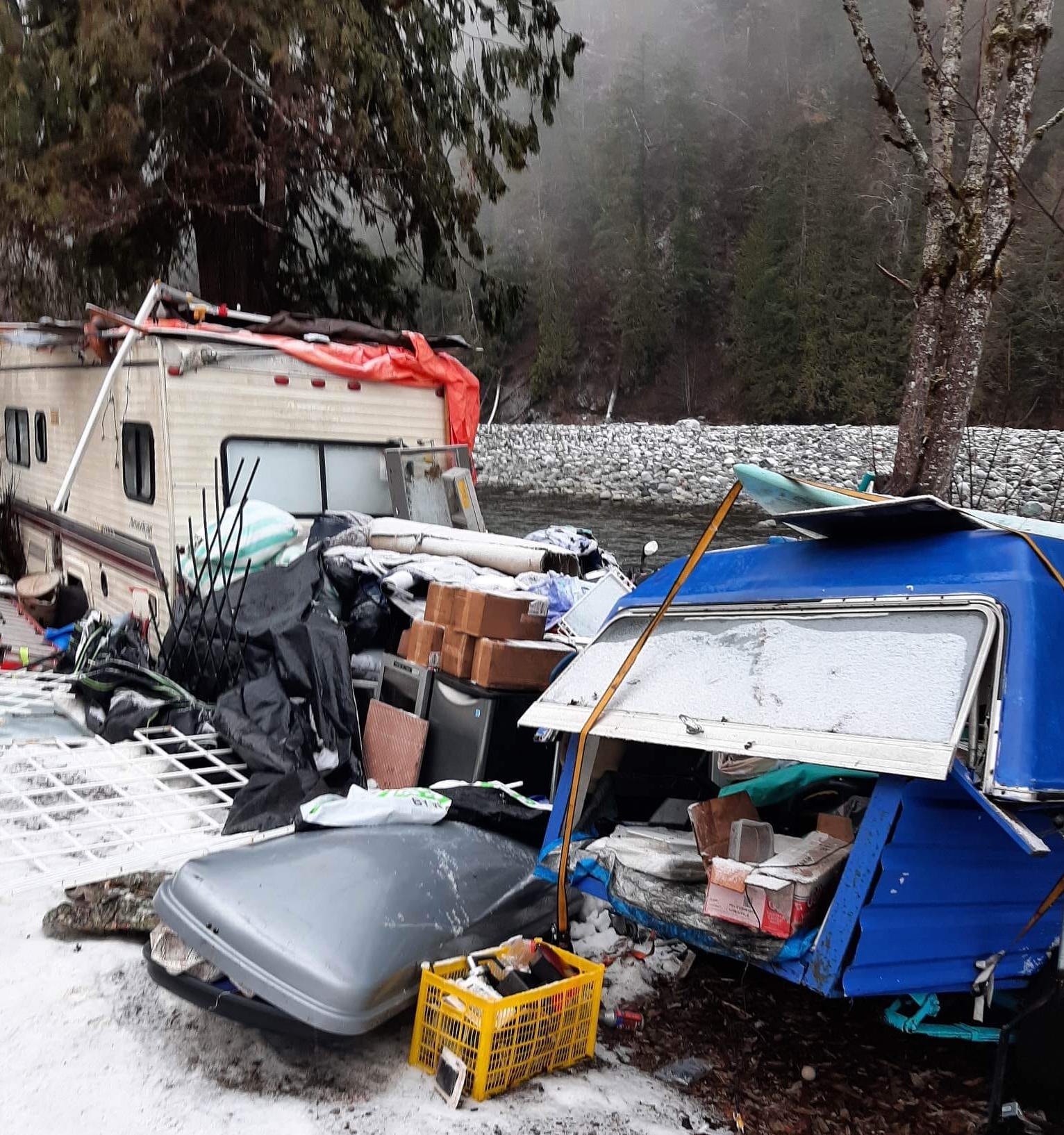 They may have another gargantuan task on their hands now that a massive homeless encampment approximately 4.5 kilometers east of the Tamihi Rapids bridge, east of Chilliwack, has been abandoned. The camp consists of a motorhome, RV, trailer, and mounds of toxic junk and debris.