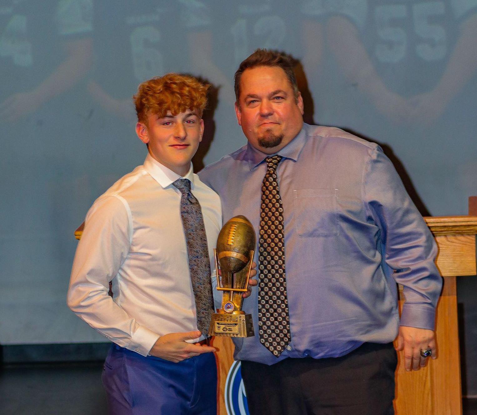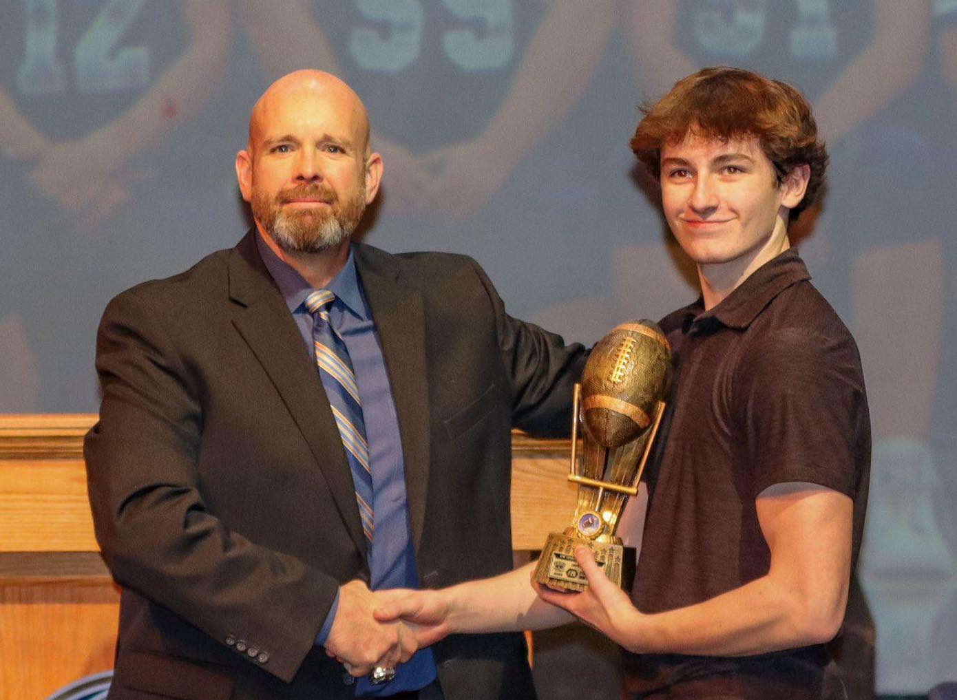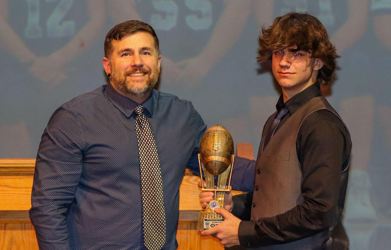 Image: Supplied by Joanne Hewitt, permission granted by Ian Parks / G.W. Graham head coach Luke Acheson, looking like a proud coach, is pictured with senior varsity Most Valuable Player Tyson Orregaard, who had 64 catches for 1,191 yards and 14 TDs. G.W. Graham held an awards ceremony over the weekend to recap a successful senior varsity and equally successful junior varsity season. Orregaard has committed to play with the University of Manitoba Bisons.