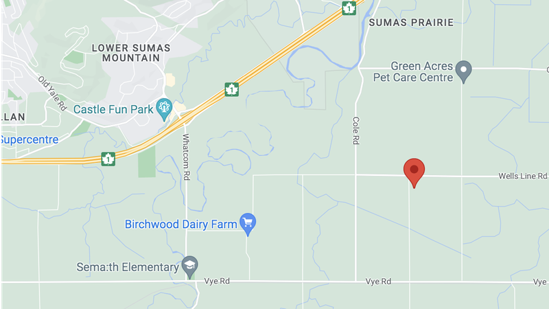 Image: Google Maps / A red pin indicates the location of a home invasion robbery that occurred Monday, April 10 sometime after midnight at a residence/farm in the 1500 block of Bowman Road in Sumas Prairie east of Abbotsford. Abbotsford Police say the property was the location of an active marijuana grow operation.