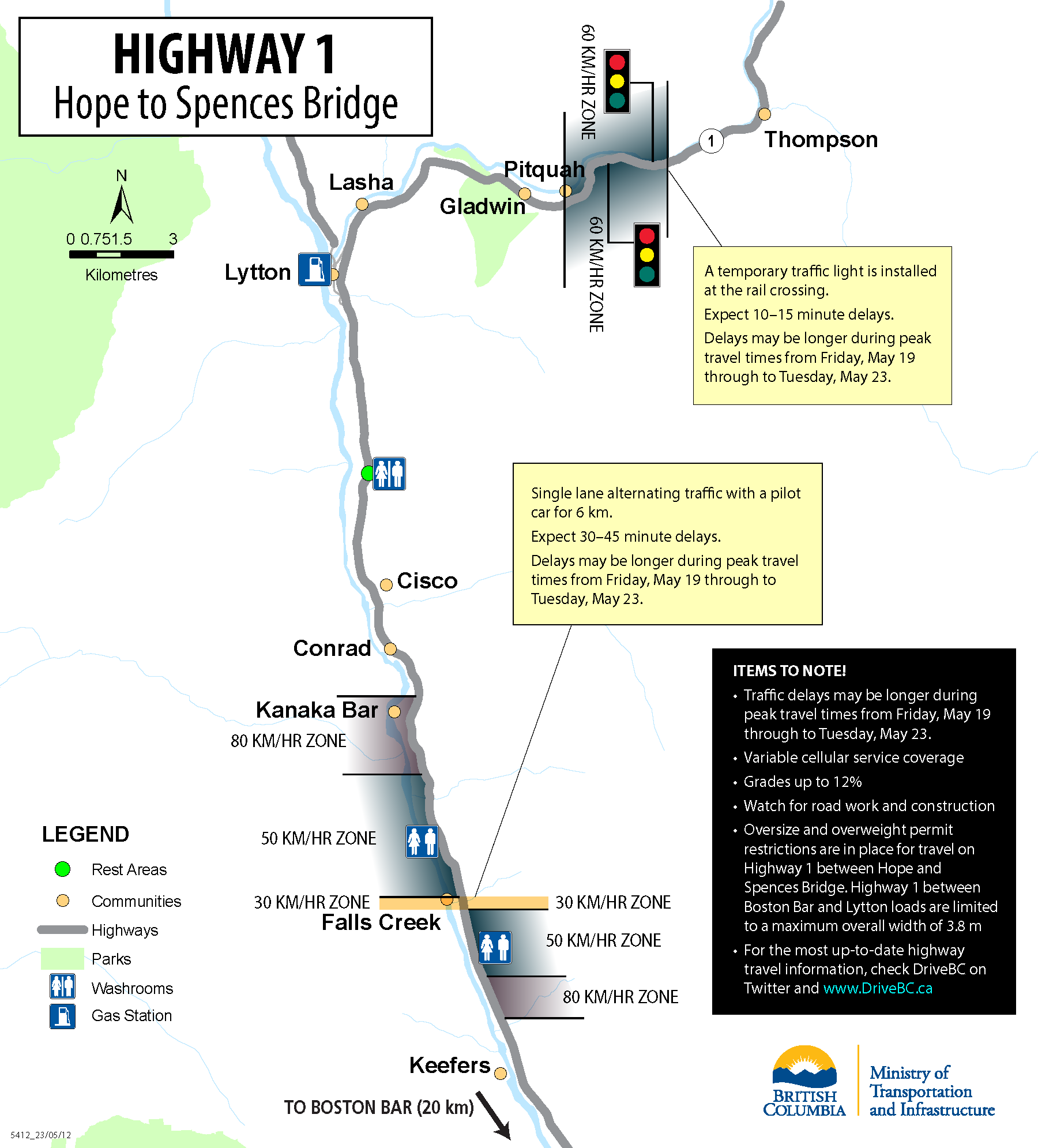 Road work at Falls Creek, approximately 20 km north of Boston Bar, has reduced the highway to a single lane of alternating traffic with a pilot car being used to ferry traffic across a six-kilometre stretch. Delays of up to 45 minutes could be facing drivers over the stretch of road.