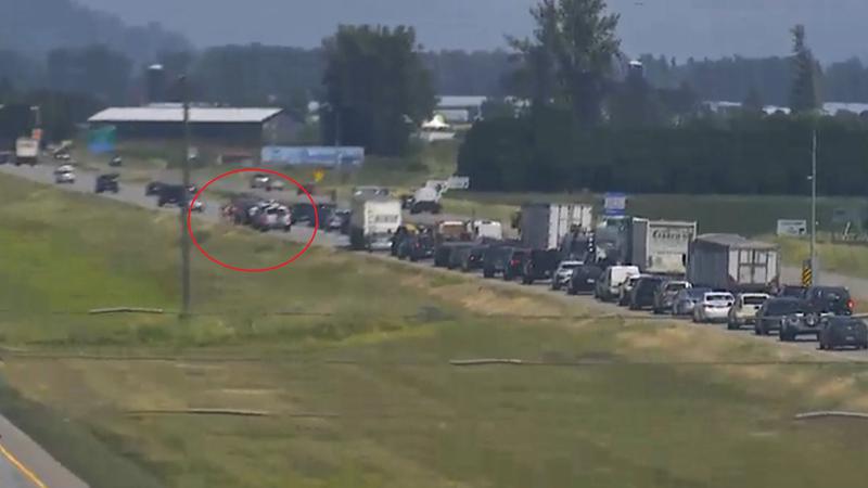 A picture shared by Drive BC shows traffic backed up extensively on eastbound Highway 1 as of 1:26 p.m.