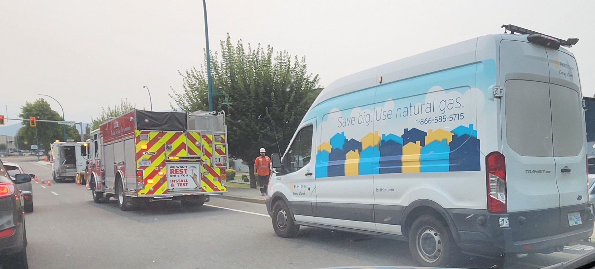 Image: Mike Vanden Bosch / Pattison Media / FortisBC and Chilliwack Fire Department vehicle on scene Monday after an excavator reportedly hit a gas line at, or near, a construction site.Three fire engines from Chilliwack Fire Department were dispatched to the 45000 block of Commercial Court, just west of Evans Parkway, after an excavator reportedly hit a gas line sometime after 12:30 p.m.