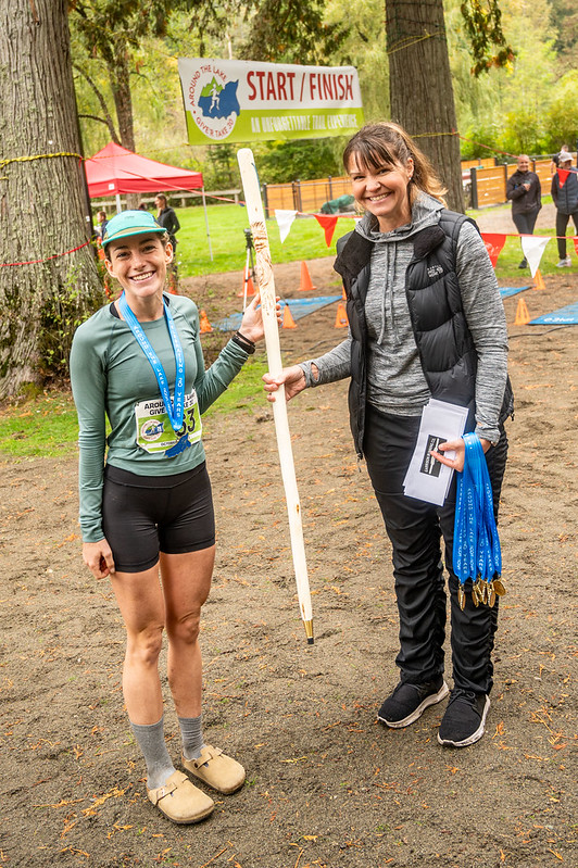 Top male and female solo finishers received unique walking sticks carved by Rick Den Braber. A special presentation of a carved walking stick was made just before the start by race founder Clarence Wiens, to acknowledge and thank the Around the Lake Give ‘R Take Race’s ultimate supporter and participant Alex Marks, who has participated in every year of the race as well as being a sponsor.
