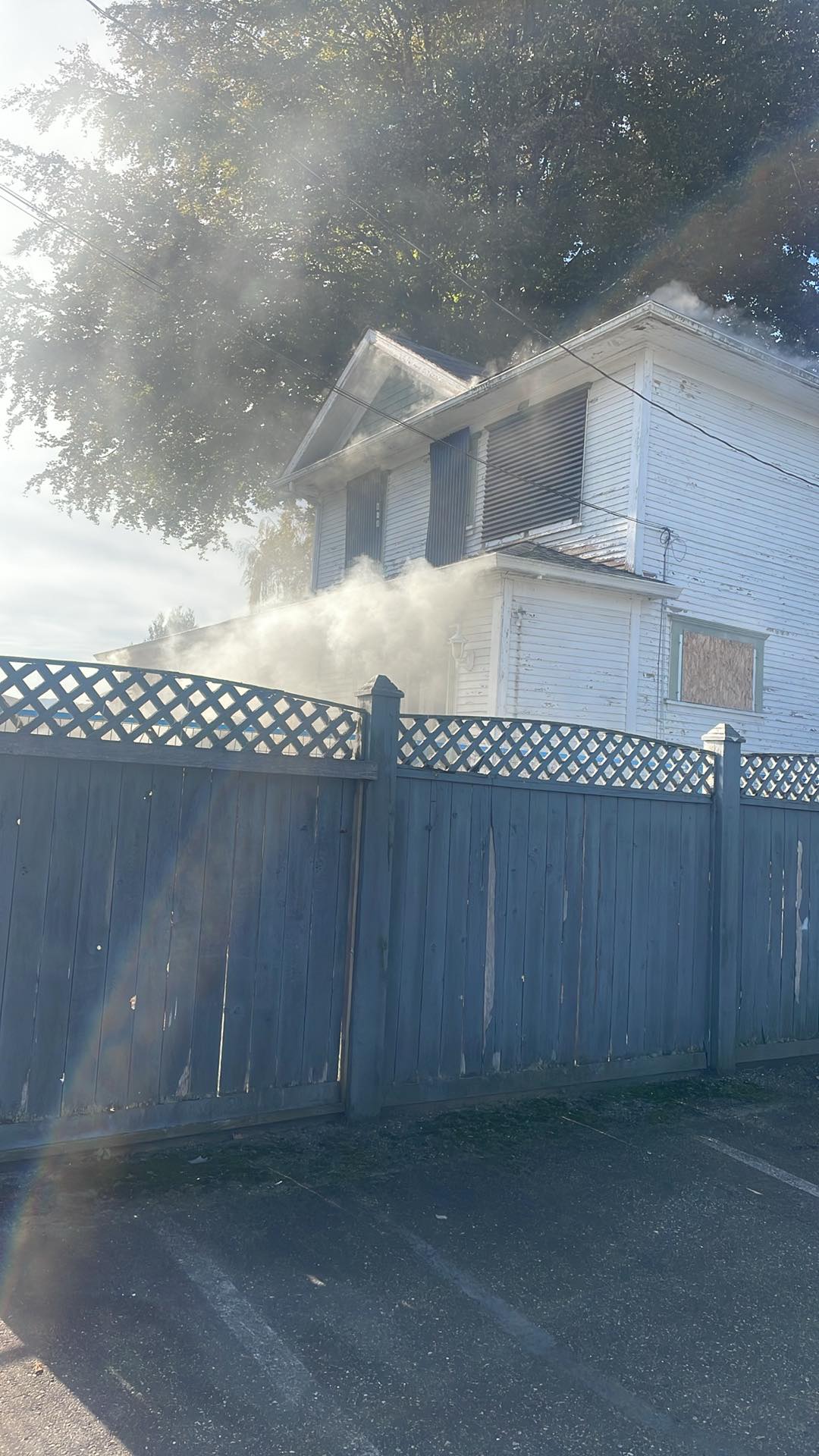 Chilliwack resident Julie Hiscock shared an image of smoke billowing from a boarded up home at about 12:30 p.m. The fire continues to produce a significant amount of smoke as of 12:40 p.m.