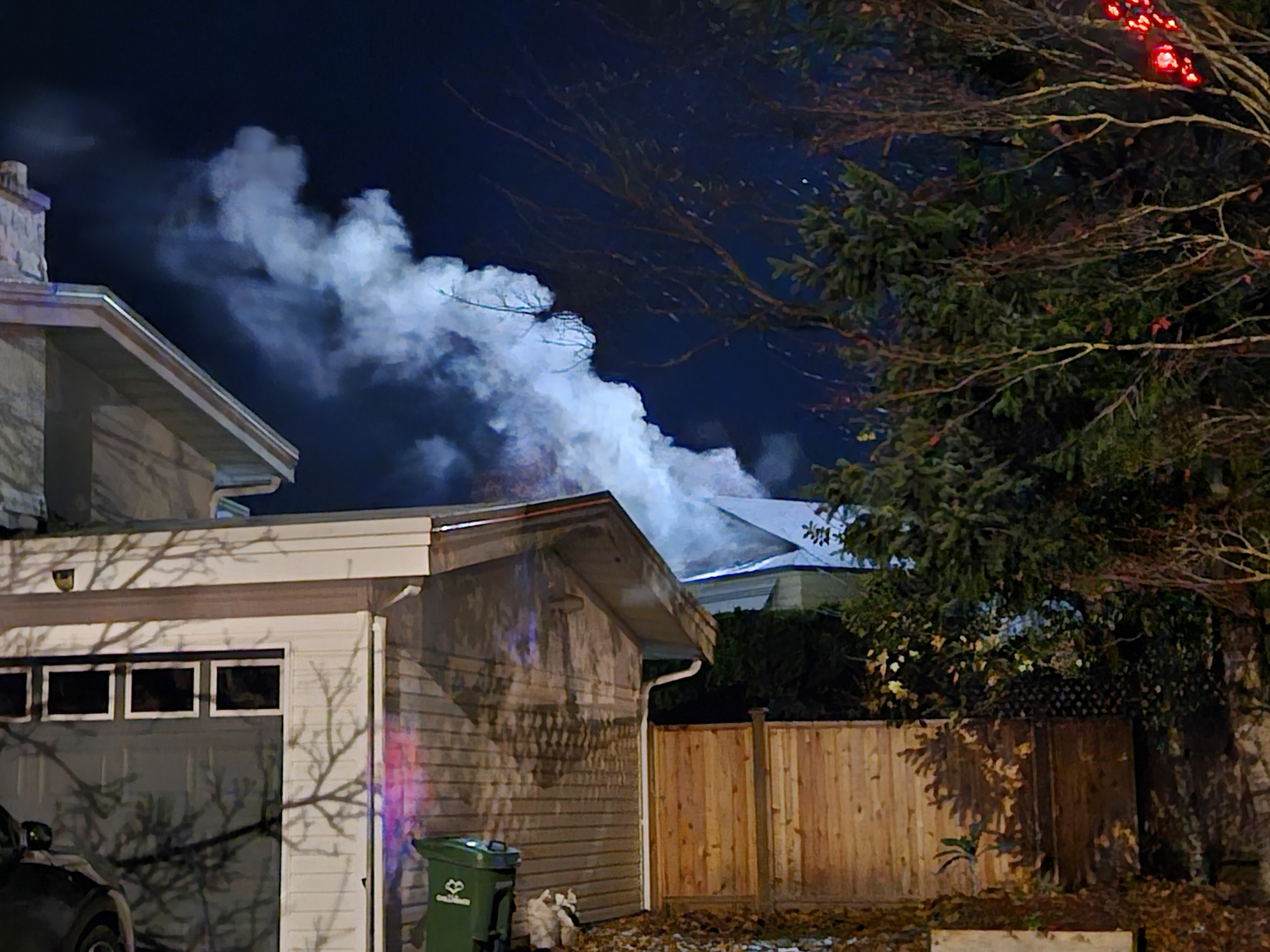 At the scene of the fire, smoke could be seen billowing from the apex of the home, possibly along the roof line, as the sound of a fire alarm emanated from the home.