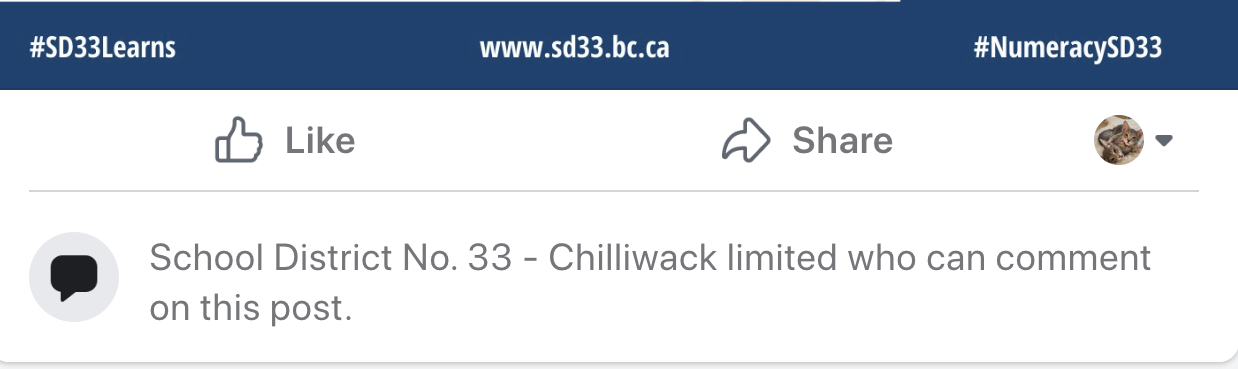 On Facebook, users can only respond with a like or similar emoji and share the post. There’s a disclaimer note at the bottom of a Facebook post that states, “School District No. 33 – Chilliwack limited who can comment on this post.”