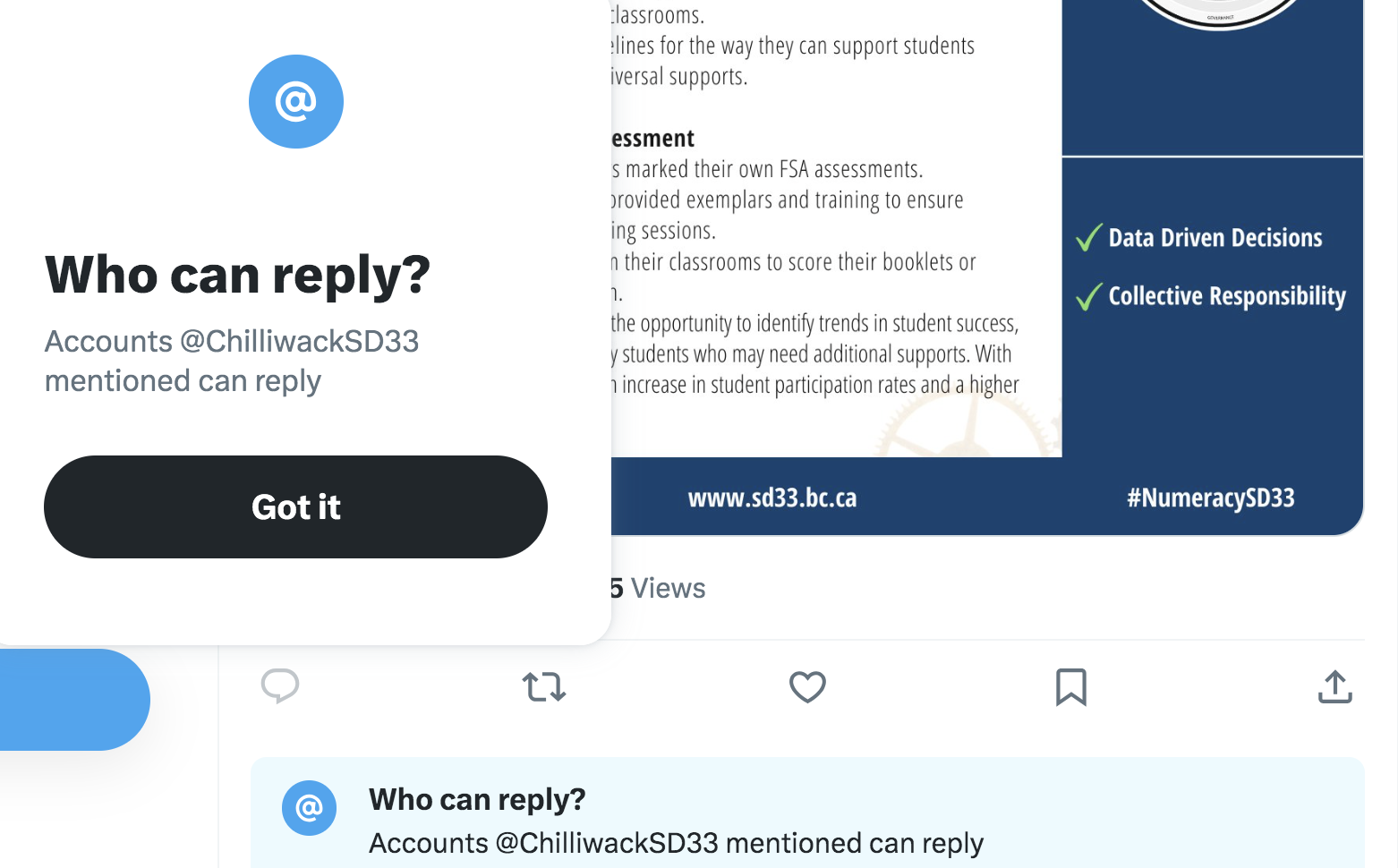 Image: X/Twitter / A note on X that indicates only accounts mentioned by the Chilliwack School District can comment on their social media posts.