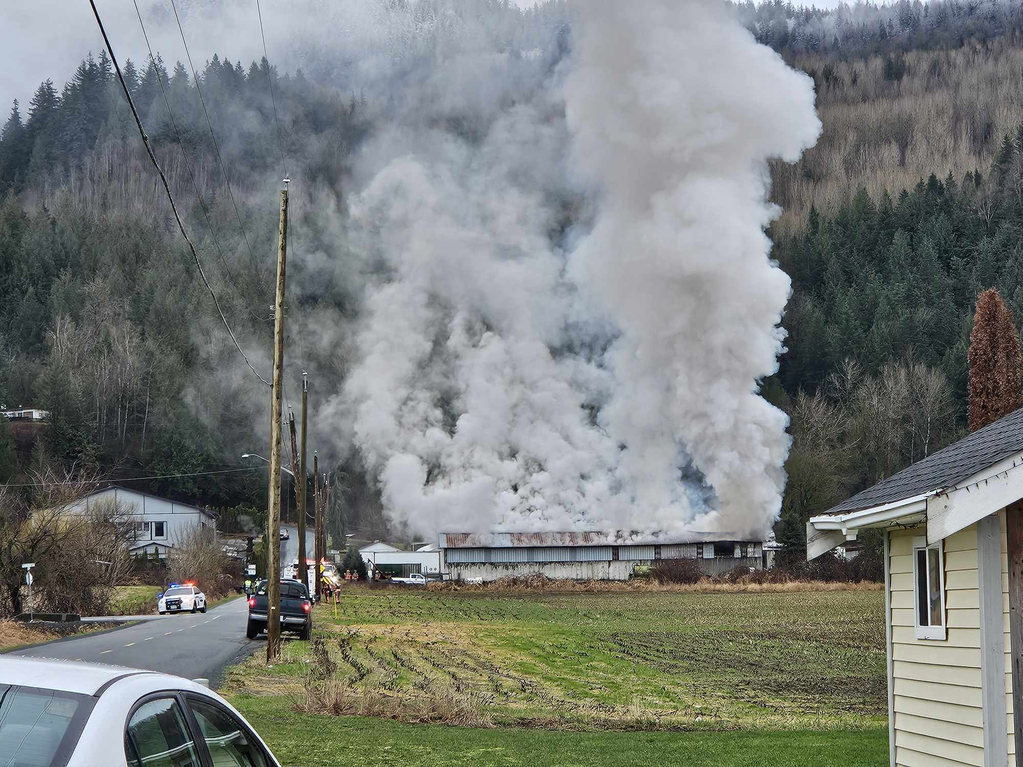CHILLIWACK — At least eight fire engines and over two dozen firefighters were deployed Thursday morning (Feb. 29) to a massive farm shop that erupted in flames, sending columns of smoke that could be seen all across Chilliwack.