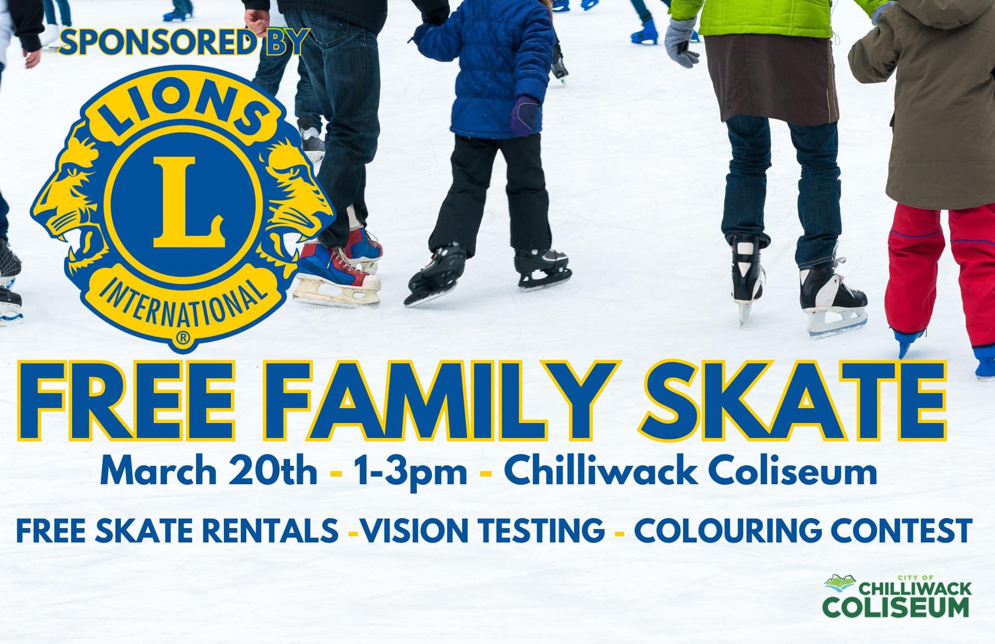 The Mount Cheam Lions Club will hold a free family skate, complete with free skate rentals, on Wednesday, March 20 from 1 p.m. to 3 p.m. at the Chilliwack Coliseum.