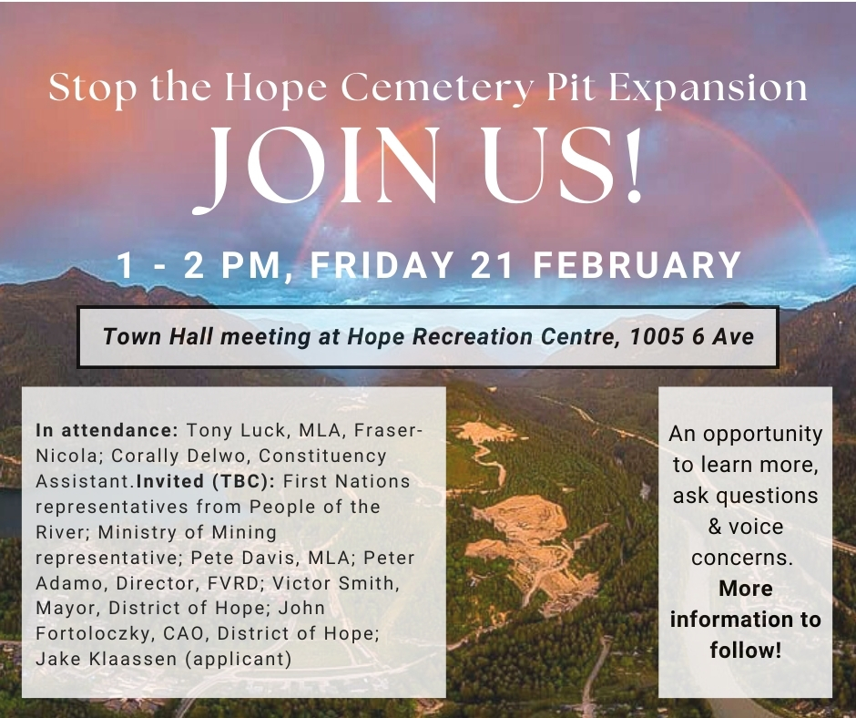 A town hall to discuss the proposed expansion is set for next Friday, February 21 from 1 p.m. to 2 p.m. at Hope Recreation Centre, 1005 6 Avenue. Elected officials and other key representatives who have been invited to attend include Fraser-Nicola MLA Tony Luck, First Nations representatives from People of the River, B.C. Ministry of Mining, MLA Pete Davis (Kootenay-Rockies), FVRD Director Peter Adamo, District of Hope Mayor Victor Smith, District of Hope Chief Administrative Officer John Fortoloczky, and the applicant, Jake Klaassen of Hope Ready Mix, the company behind the proposed project.