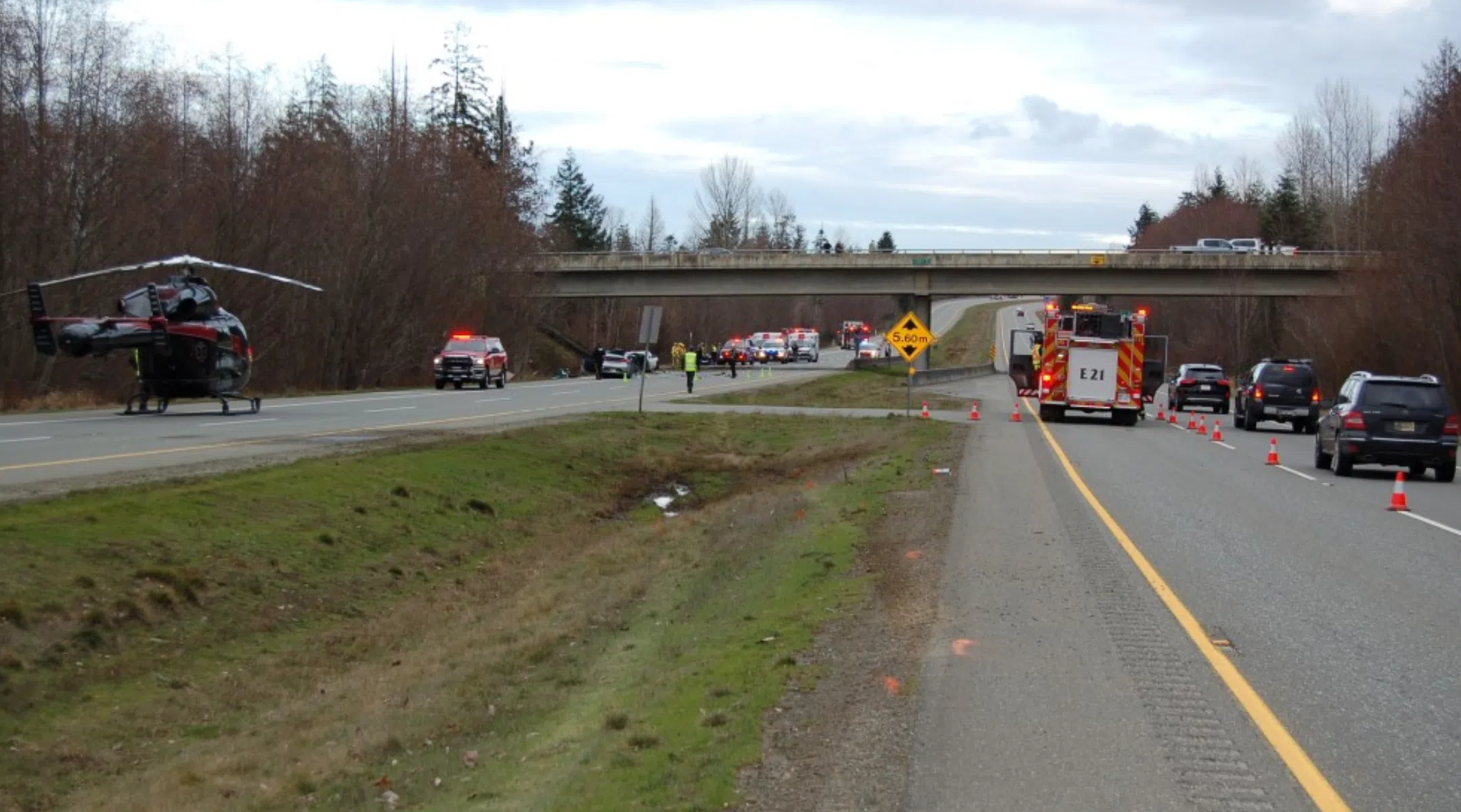A statement from B.C. Highway Patrol says three people, including a child, were taken to hospital after the crash Monday on Highway 19.