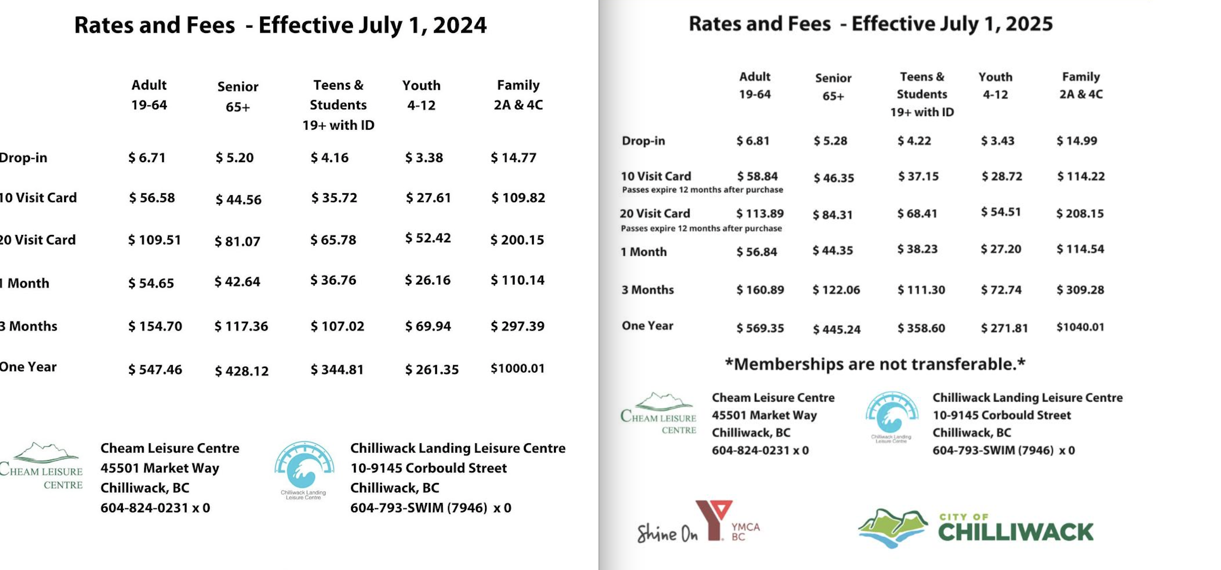 According to a social media post from YMCA BC, which has a contract with the City of Chilliwack, rates and fees will rise effective July 1 at the Cheam Leisure Centre in Garrison and the Chilliwack Landing Leisure Centre at Hodgins and Corbould.