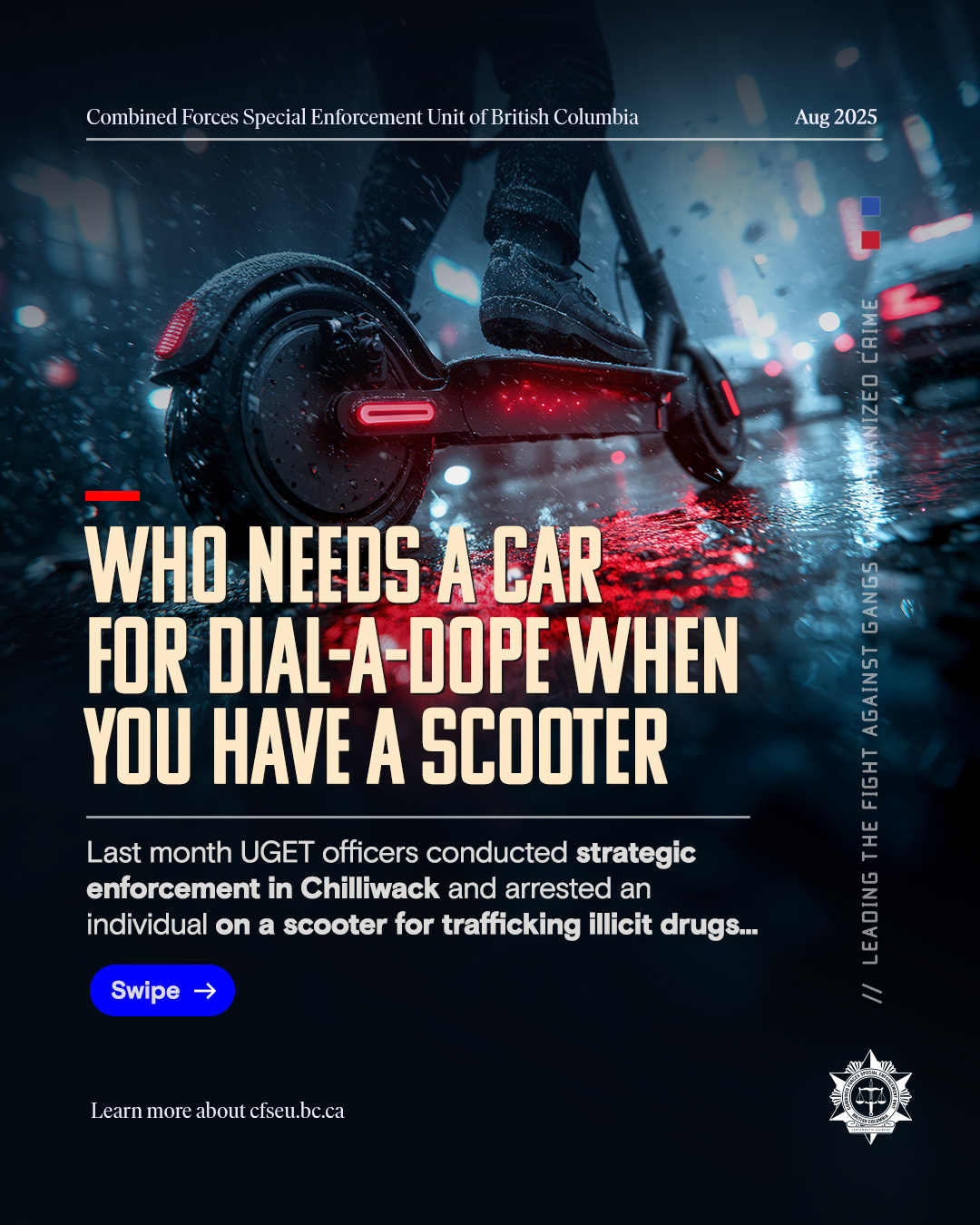 Gang detectives from a B.C.-wide special task force who were conducting strategic enforcement in Chilliwack in July say they have arrested an individual who was riding a scooter and trafficking illegal drugs.