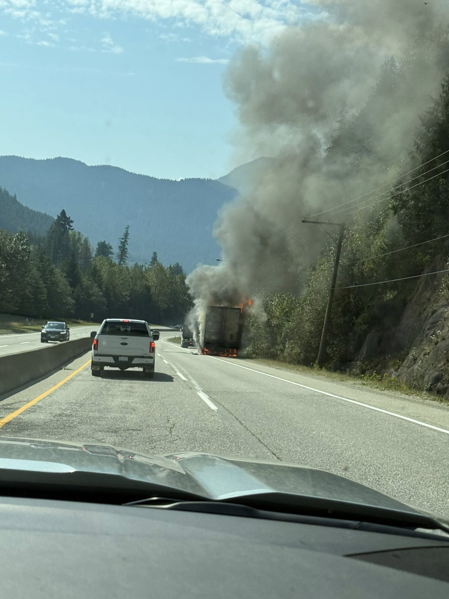 Image: Paige van Rhyn / Facebook / Drivers are asked to stay alert after a semi set on fire on the Coquihalla Friday, August 29.