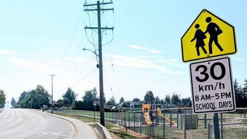 Image: Mission RCMP / Provided / Mission RCMP is urging drivers to pay attention to school zone signs, like the one along Stave Lake Street, as kids start heading back to class this week.