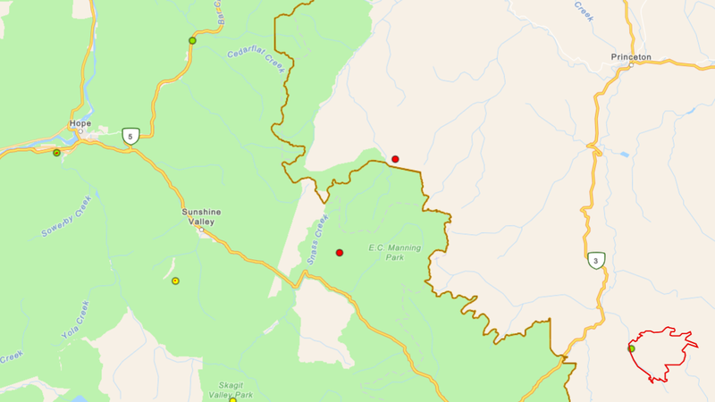 The BC Wildfire Service portal says one out-of-control fire was discovered roughly 2.6 kilometres west of Turnbull Creek, approximately 30 minutes southeast of Hope. Its cause is still under investigation.