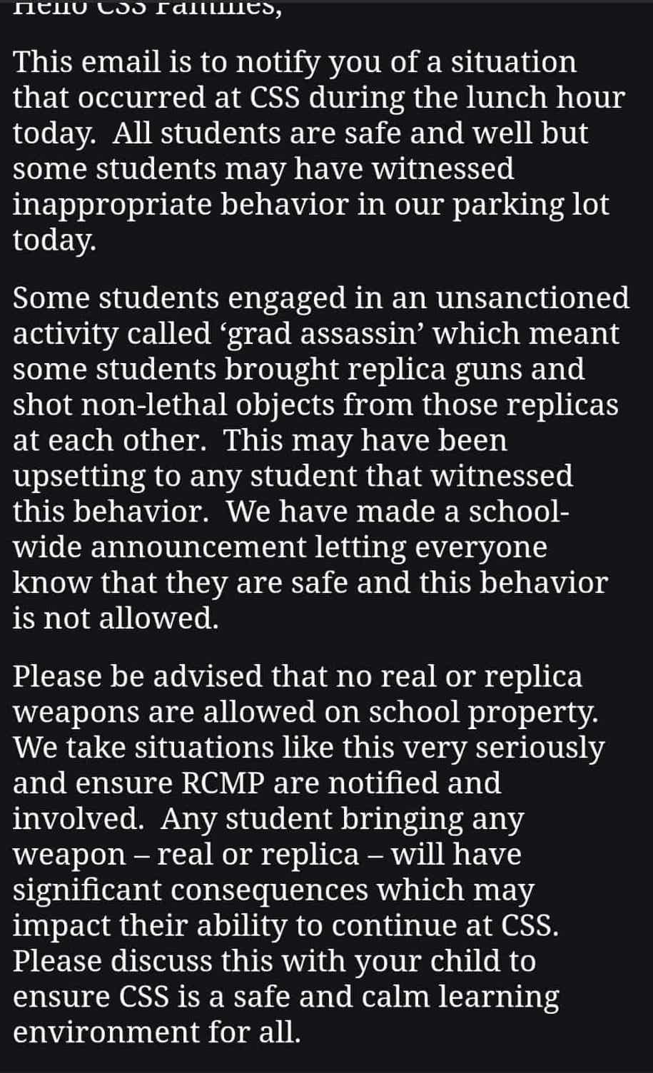 “This email is to notify you of a situation that occurred at CSS during the lunch hour today,” the email stated. “Some students engaged in an unsanctioned activity called ‘grad assassin’ which meant some students brought replica guns and shot non-lethal objects from those replicas at each other. This may have been upsetting to any student that witnessed this behavior. We have made a school-wide announcement letting everyone know they are safe and this behavior is not allowed.”