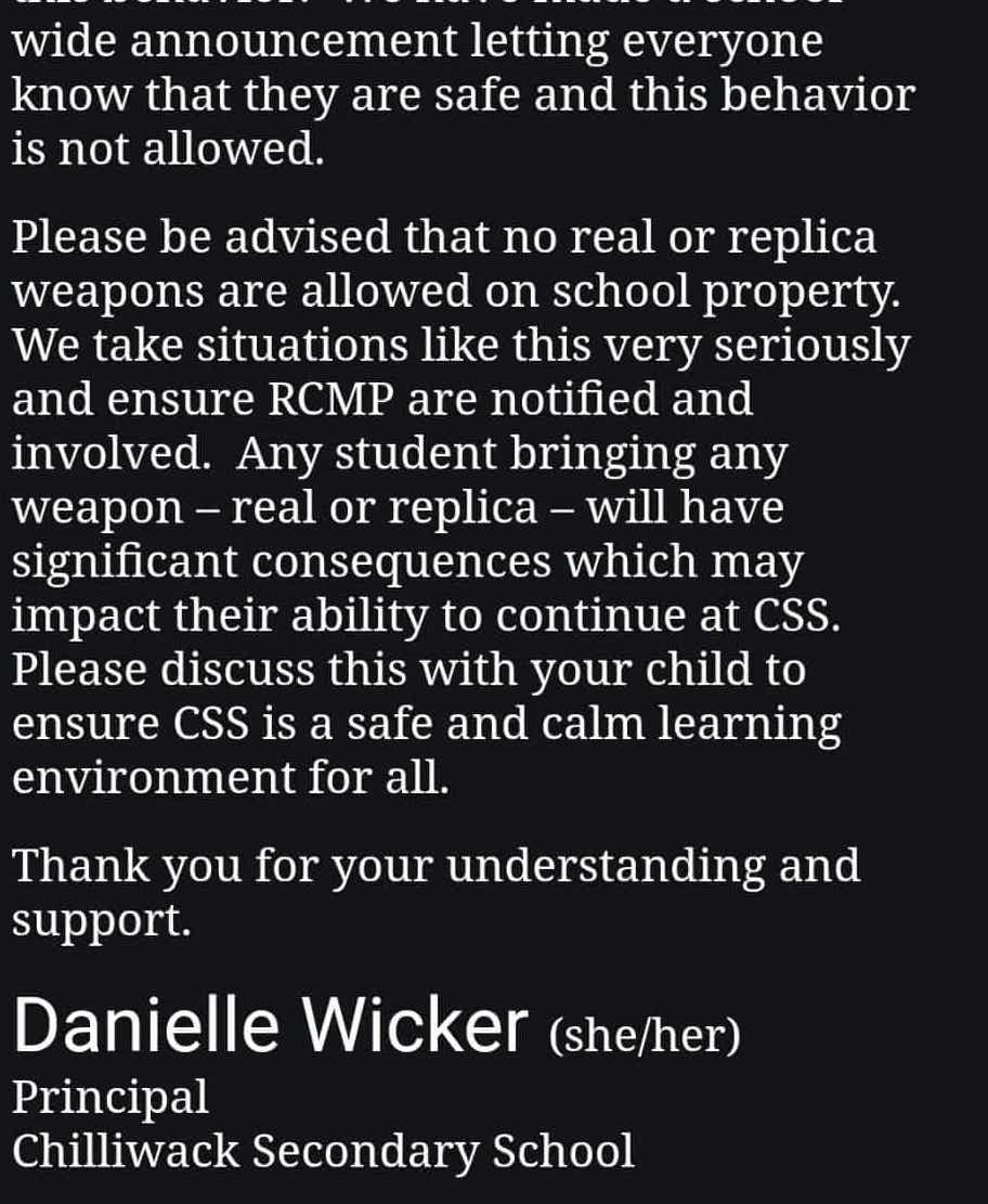 Chilliwack Secondary principal notifies parents about incident involving replica guns