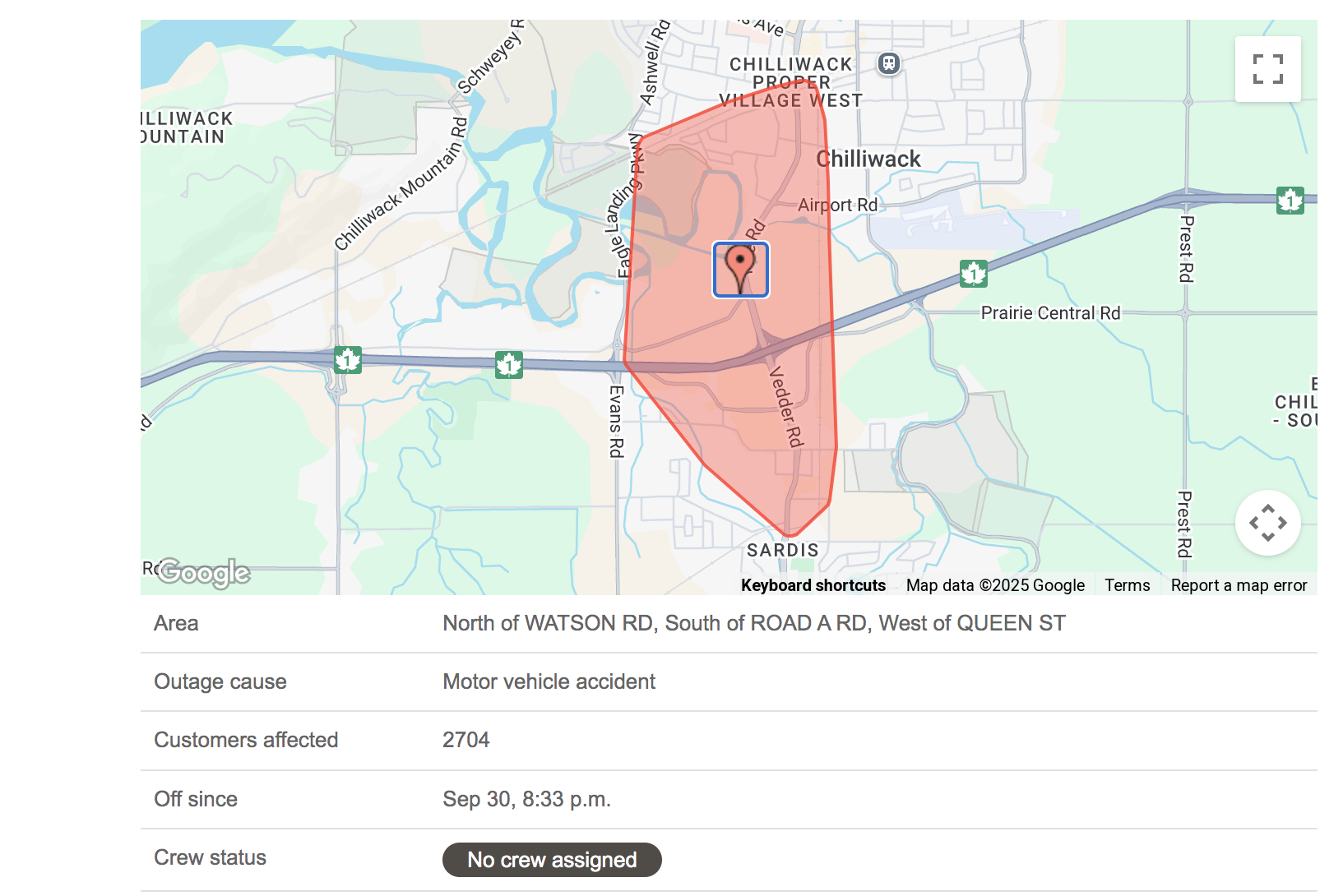 UPDATE #1, 9:43 P.M.: BC Hydro crews are now on scene as personnel work to repair the BC Hydro infrastructure damaged after a truck reportedly struck a pole along Yale Road in Chilliwack. Hydro’s website was last updated at 9:38 p.m.