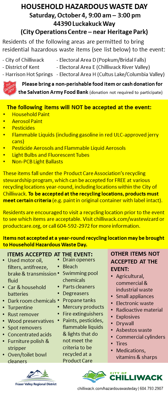 From 9 a.m. to 3 p.m. Saturday (Oct. 4), folks are encouraged to drop off their hazardous waste, including oil, oil filters and antifreeze, for free at the Operations Centre parking lot next to Chilliwack Heritage Park.