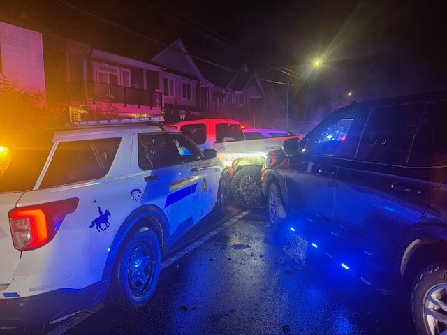 Around the same time, other RCMP officers were conducting patrols in the downtown core when the suspect vehicle entered the area and was observed driving erratically through side streets. The truck eventually encountered a marked police vehicle, changed direction, and collided head-on with a second police cruiser. Despite the impact, the driver continued to flee, failing to stop at multiple controlled intersections.