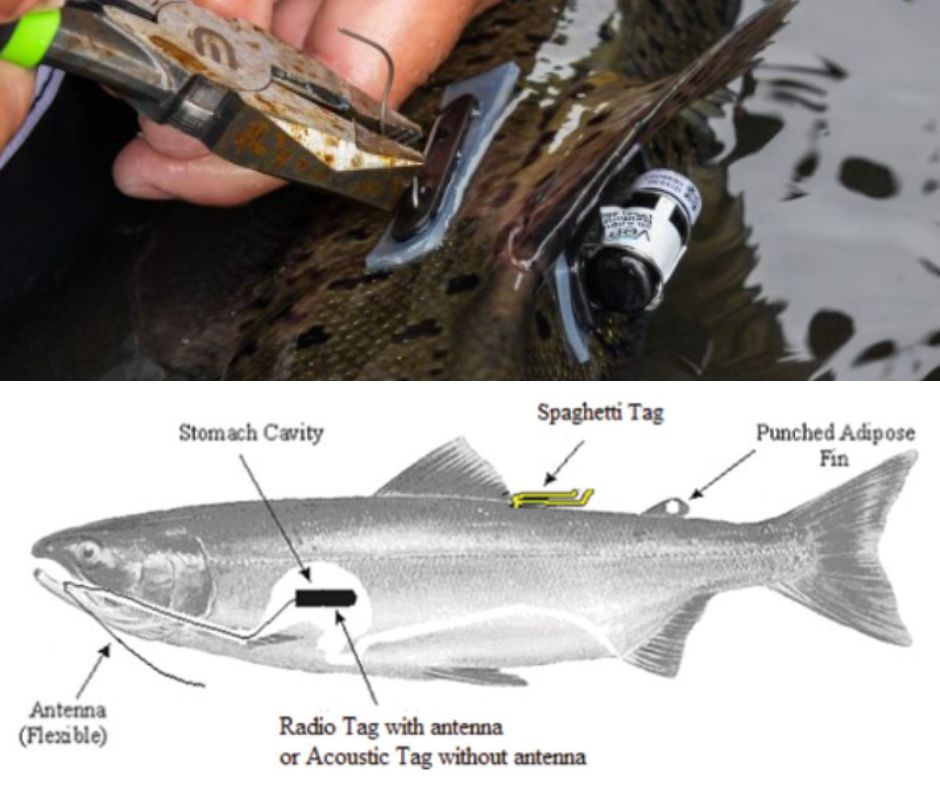 The nature reserve included a picture of accessories that salmon may have embedded, including a flexible antenna, a radio tag in their stomach cavity, a spaghetti tag or a punched adipose fin.