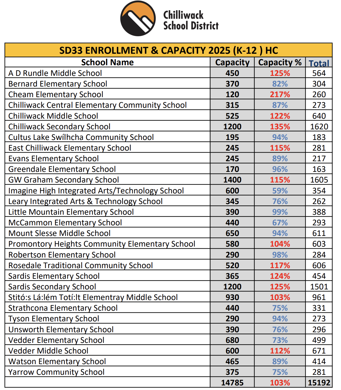 As of November 2025, total district enrolment (K-12 only) shows 15,192 students, placing the district at 103 per cent of functional capacity.