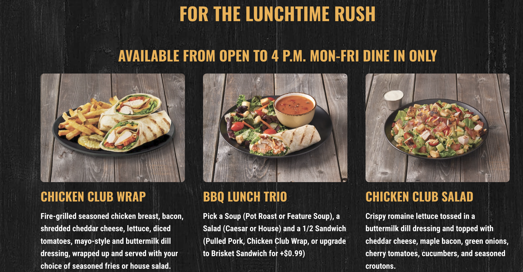 When it comes to what food it will offer, its lunch menu consists of items you might expect – like a chicken club wrap, BBQ lunch trio (soup, salad and your choice of a half sandwich – pulled pork, chicken club wrap or upgrade to a brisket sandwich), a burger and pork back ribs.