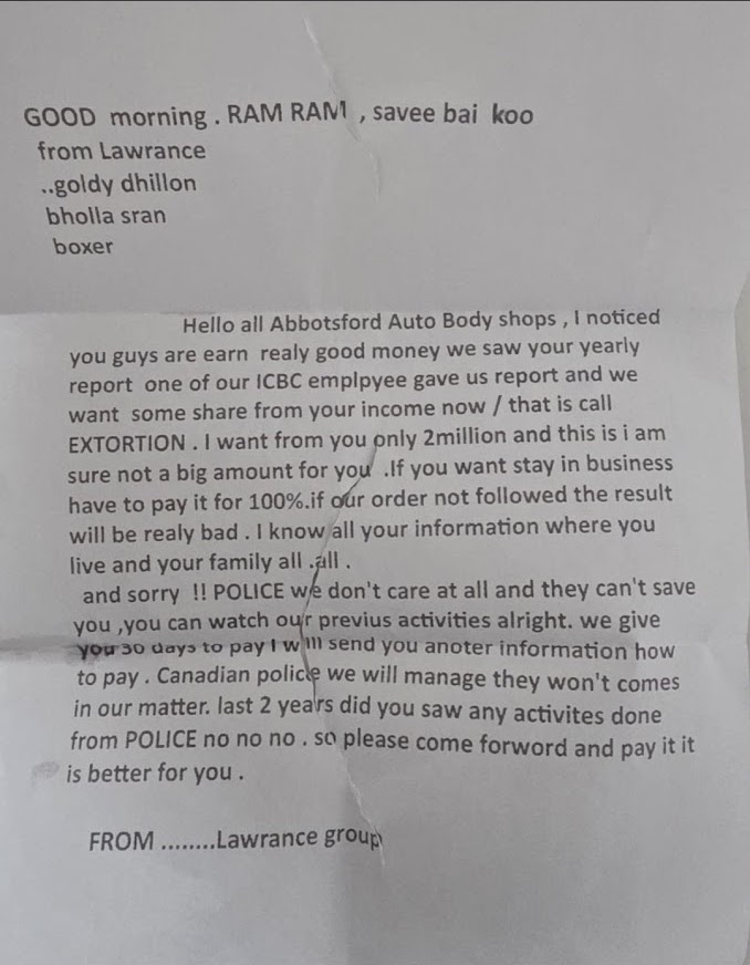 The rambling letter stated, “Hello all Abbotsford body shops, I noticed you guys are earn (sic) realy (sic) good money; we saw your yearly report one of our ICBC employee (sic) gave us report and we want some share from your income now / that is call (sic) EXTORTION. I want from you only 2 million and this, I am sure, not a big amount for you.”