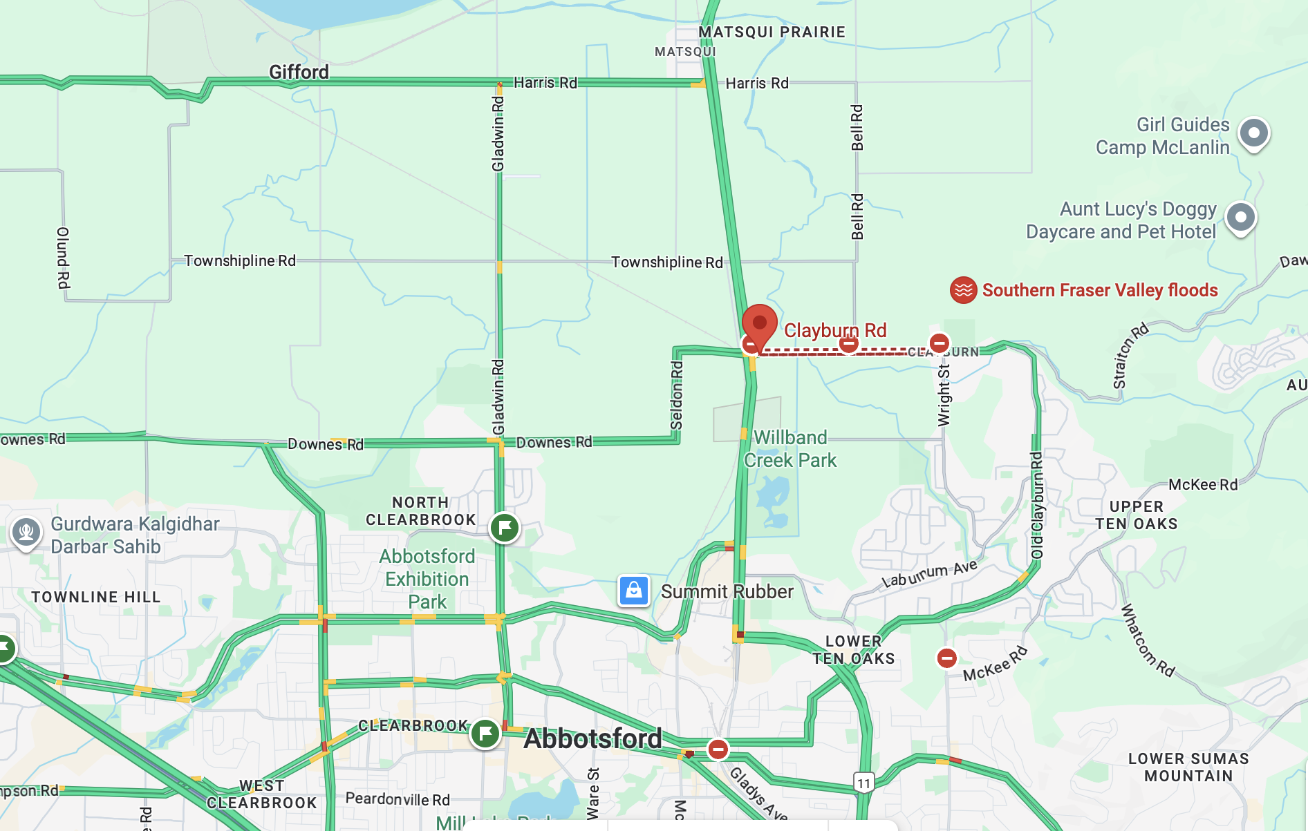 Image: Google Maps / Cole Road is currently closed between Wells Line Road and Vye Road in Sumas Prairie.Clayburn Road is also closed in both directions between Highway 11 and Wright Street.