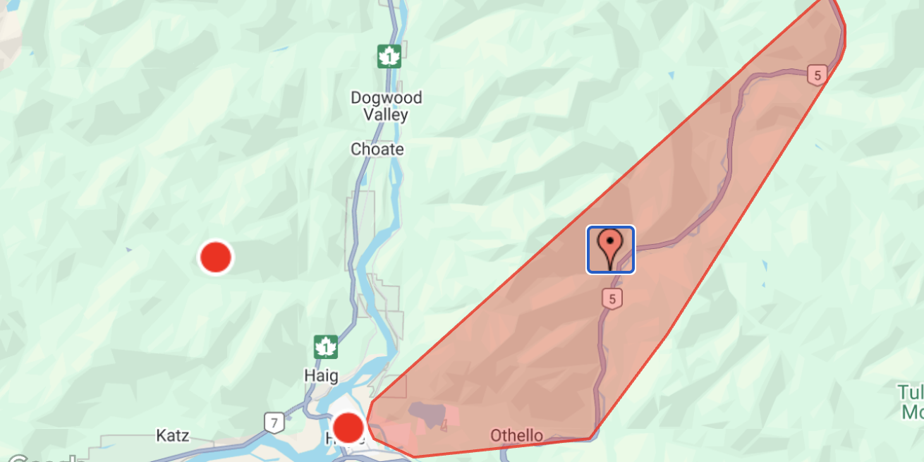 Image: BC Hydro / An outage affecting over 1,100 customers in Silver Creek, Floods, Ruby Creek, Laidlaw and west Hope.One outage impacting 963 customers is affecting east Hope, Othello and the Coquihalla Highway corridor. Those customers lost power at 3:28 p.m. No crews have been assigned there.