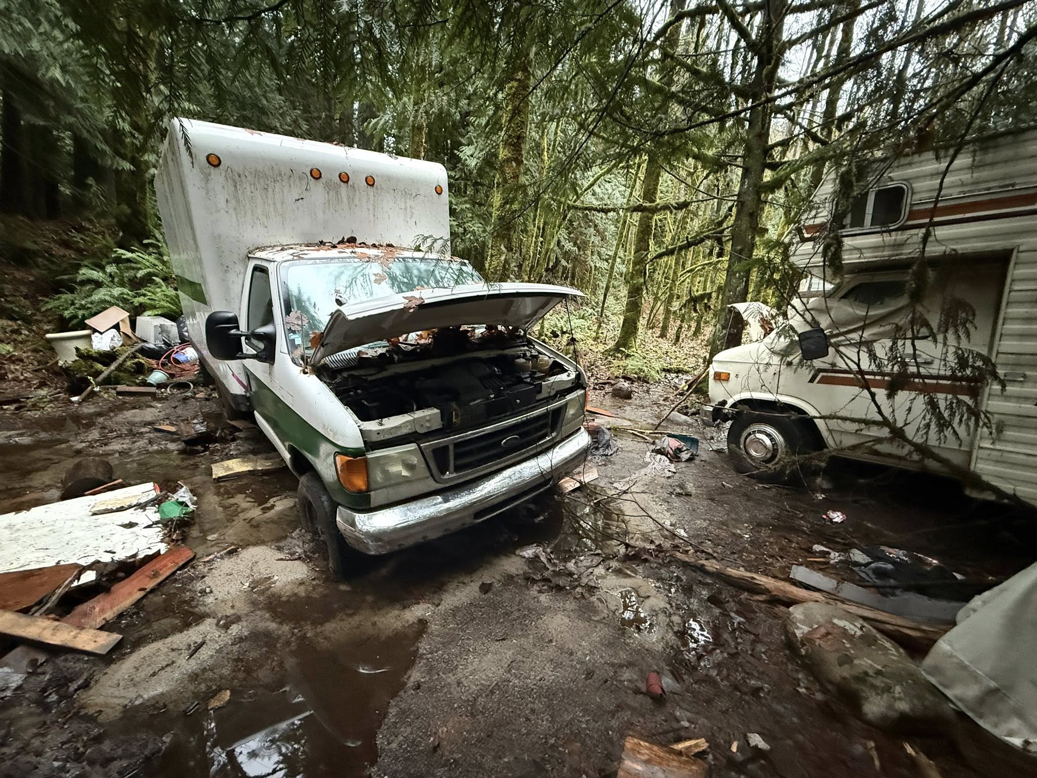Homeless camp containing multiple abandoned vehicles located up Chilliwack Lake Road