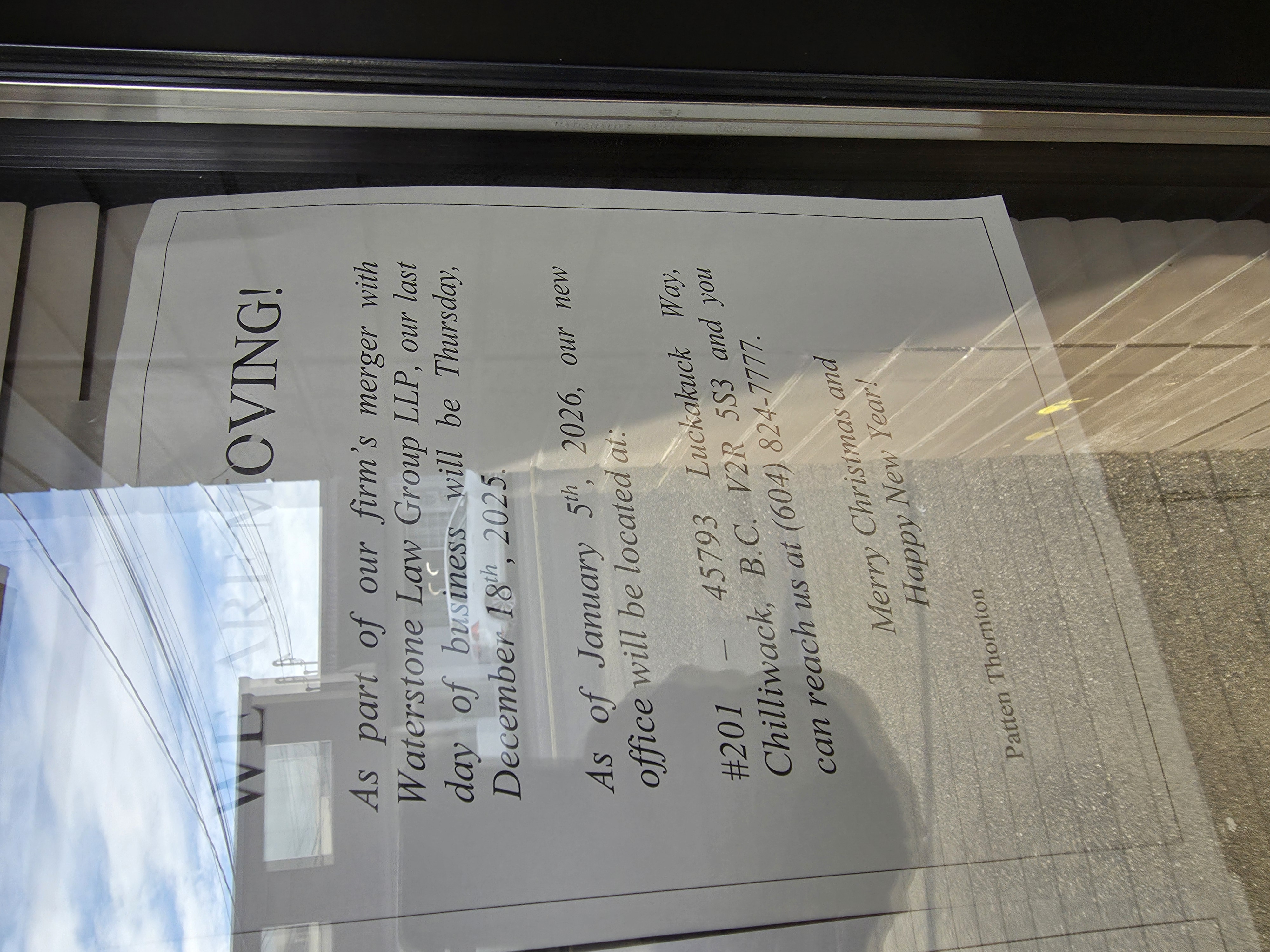 The automated email states that as part of the merger, Patten Thornton’s lawyers and staff will relocate to Waterstone’s Chilliwack office at 201-45793 Luckakuck Way in Chilliwack. Moving forward, Patten Thornton can now be reached at 604-824-7777, and its regular office hours commenced effective Monday, January 5, 2026 at 8:30 a.m.