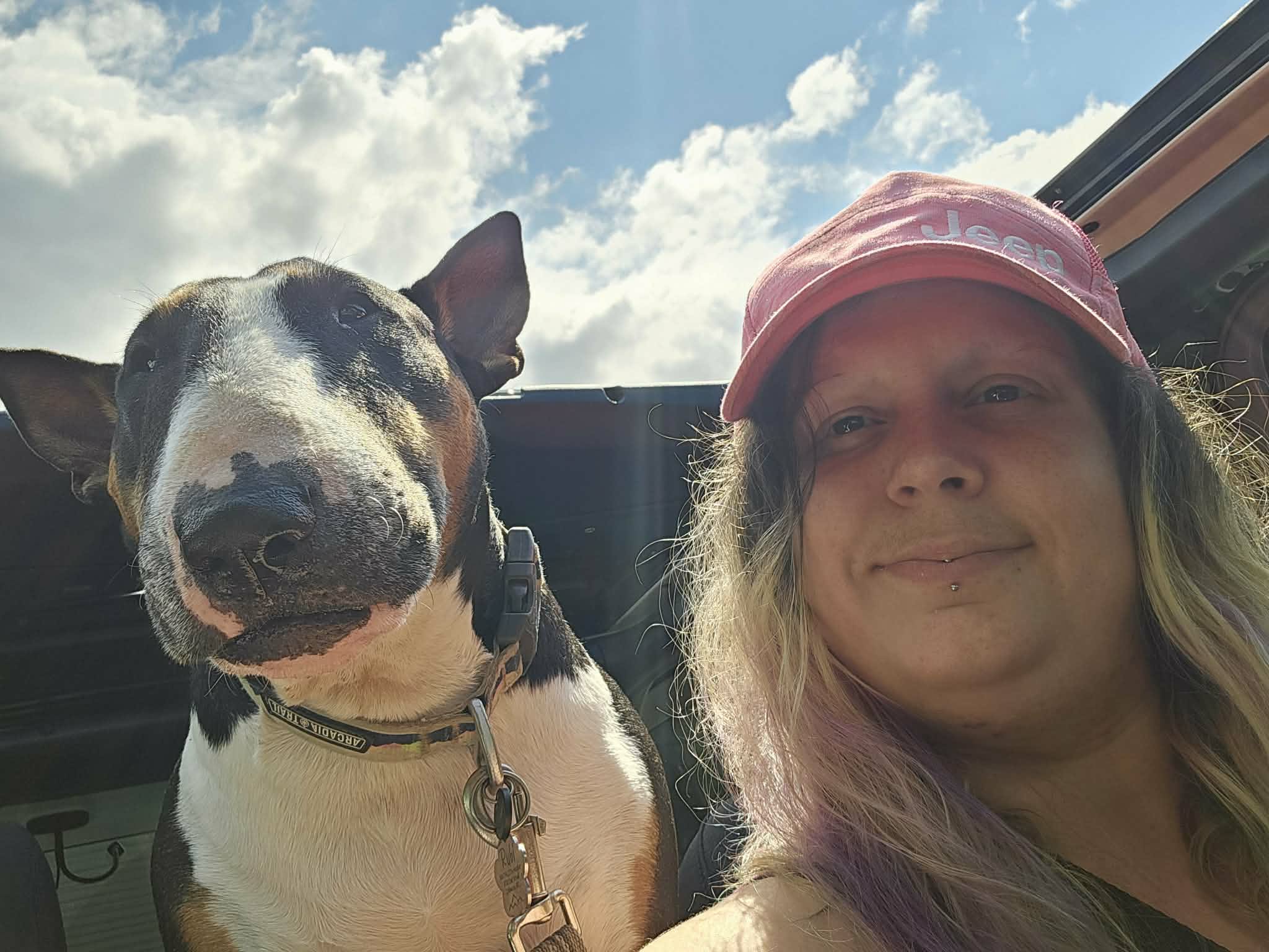 Image: Zoey’s Pawsome Pet Society / Heather Cale with her dog, Rubi. Heather is one of the pet food bank’s volunteer drivers and a fellow member of its fundraising team.