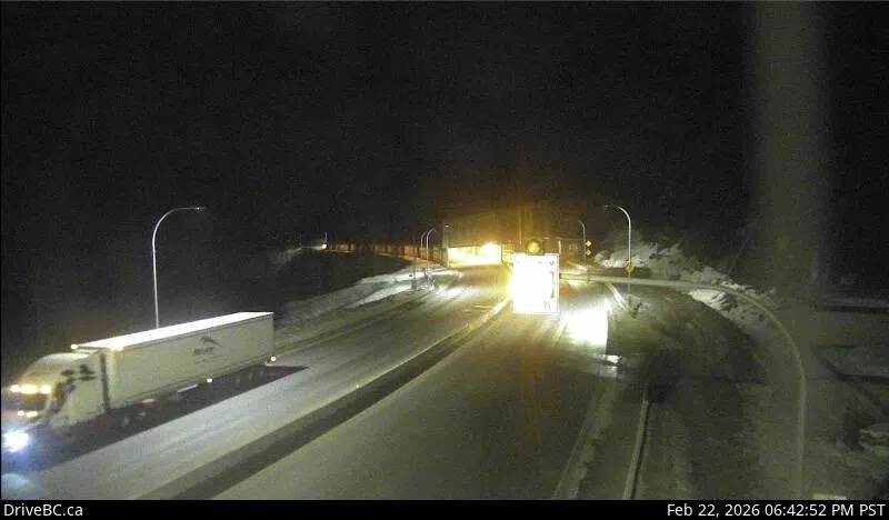 Highway 5 at the Great Bear Snowshed, looking south, at 6:42 p.m. Sunday night (Feb. 22). (Image Credit: DriveBC.)