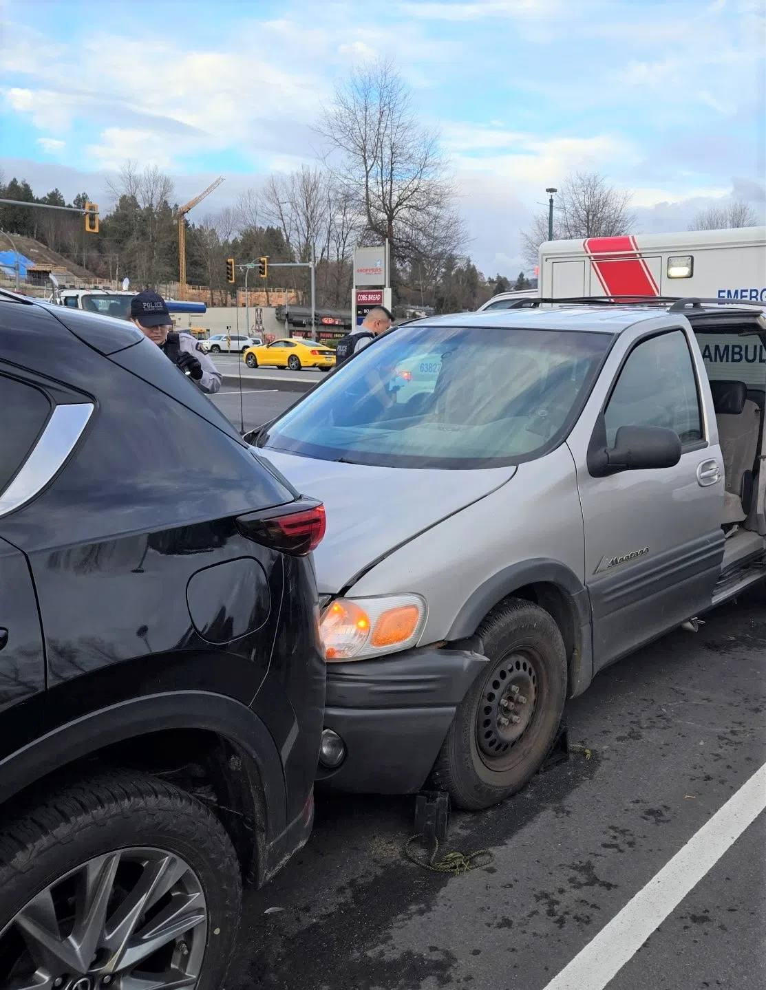 On February 23, at around 4:30 p.m., a grey Pontiac minivan drove over a curb and a sidewalk – and only stopped after crashing into two vehicles at a mall parking lot along Lougheed Highway near Haig Street.