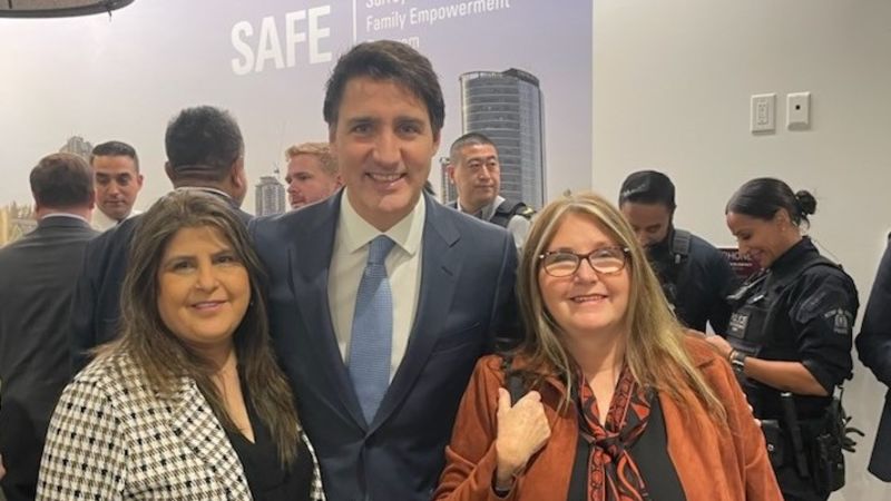 Ann Davis Transition Society executive Patti MacAhonic speaks with Prime Minister Justin Trudeau at federal handgun announcement Friday