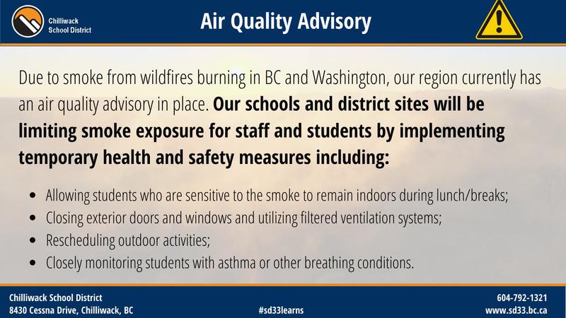 CHILLIWACK - Chilliwack School District announced Tuesday afternoon (Oct. 18) that it will limit smoke exposure for staff and students by implementing health and safety measures. These measures includ...