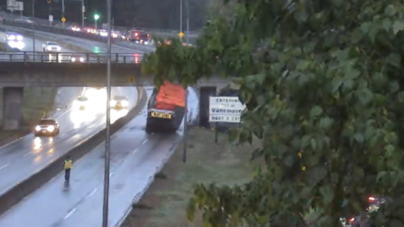 Commercial vehicle hits overpass in North Vancouver, blocks Hwy. 1 eastbound