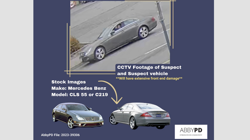 AbbyPD looking to locate heavily damaged Mercedes, driver involved in hit-and-run